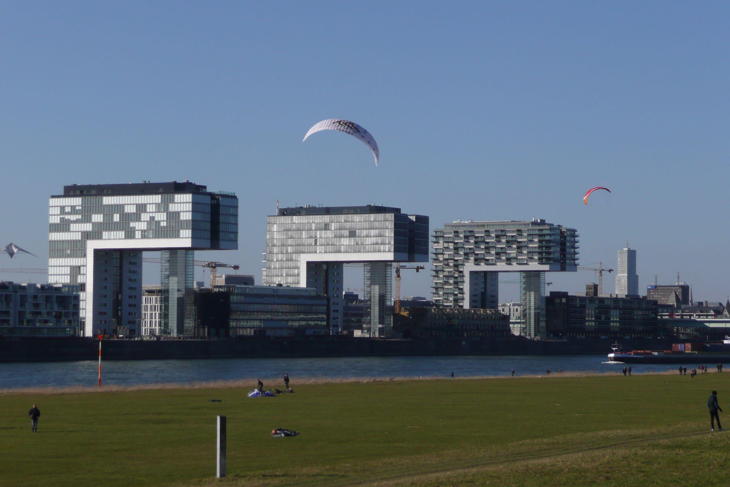 Das ist Kölns neuestes Viertel. Nach 2000 Jahren Hafengeschichte bietet sich also ein Bummel durchs Neuland, in dem noch Reste früherer Bauten stehen, an. Alice Schwarzer hat hier ihr feministisches Frauenarchiv in mittelalterlichem Gemäuer. Poldi soll auch hier wohnen. Und dann die imposanten Kranhäuser mit den Kanzleien weltweit agierender Wirtschaftsprüfer:innen und Jurist:innen... Hier im Hafen lagerte mal ein Teil der Getreidenotration für die Bundesrepublik Deutschland. Jetzt wohnen in den Hallen Menschen in schicken Wohnungen. Zum Schluss ein Blick von oben – schon schön, wenn de Sonn schön schingk!