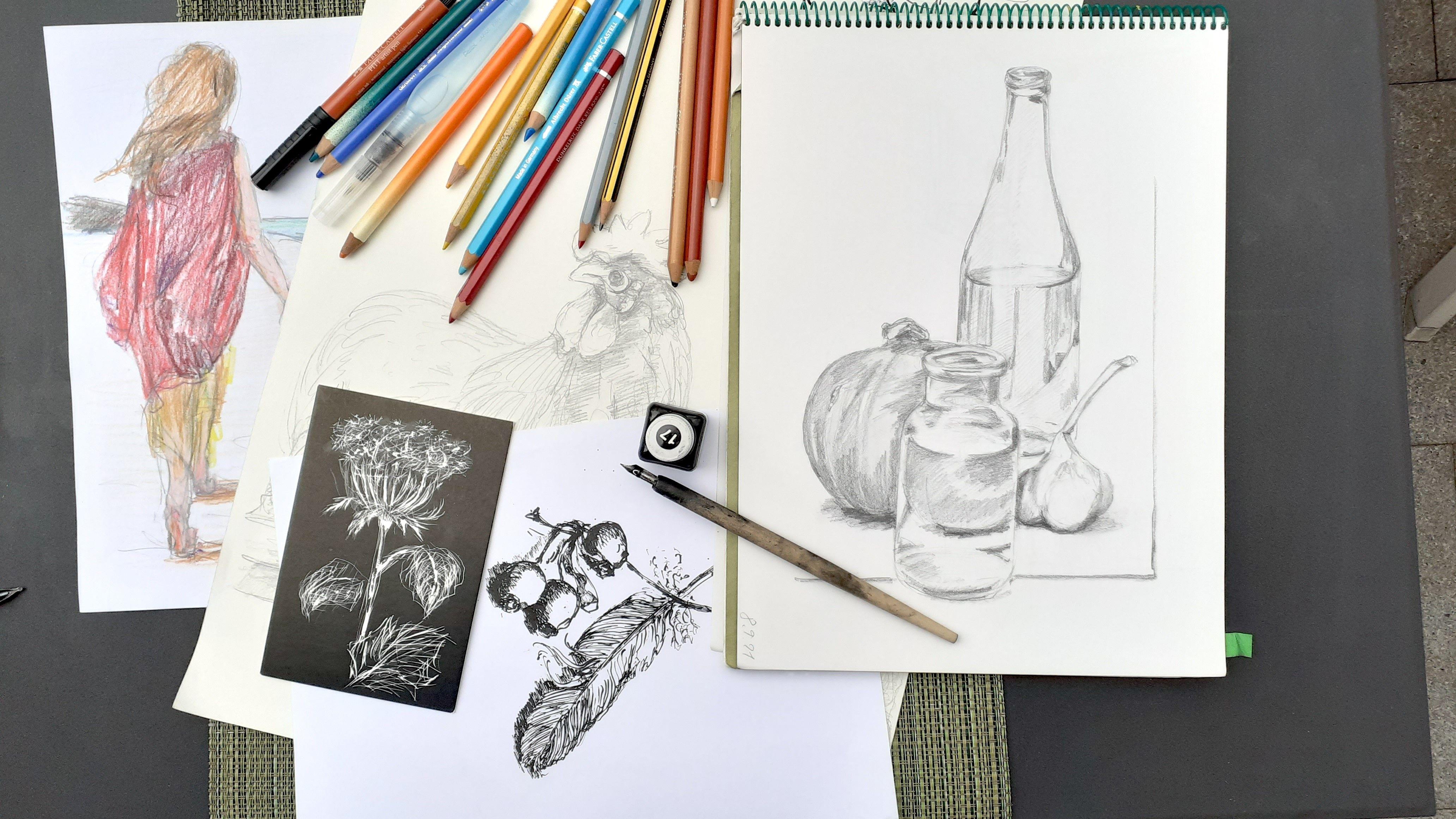 Bitte bringen Sie Bleistifte in verschiedenen Stärken, Buntstifte, Radierer und Papier oder Skizzenbuch mit.